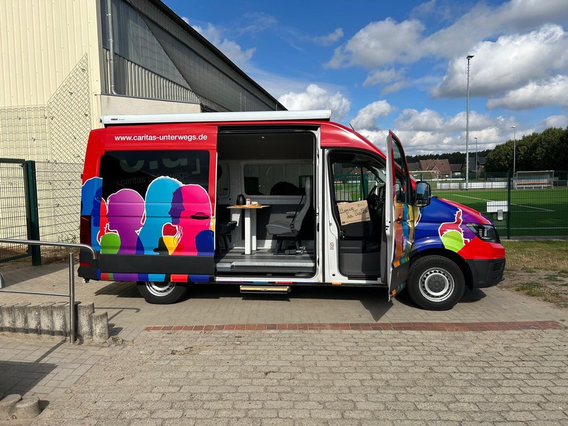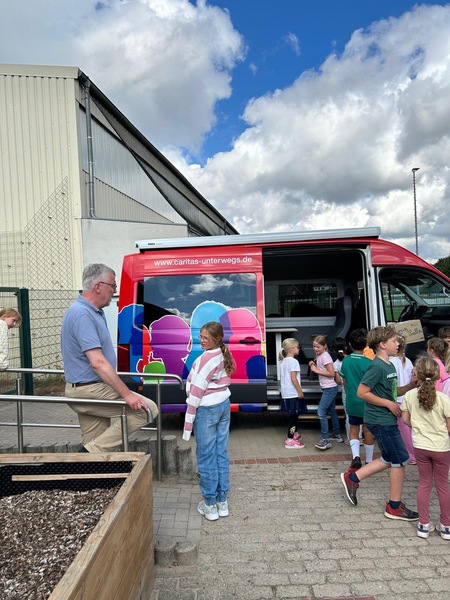 Pfarrer Bernd Strickmann ist viel unterwegs: Mit seinem Projekt „Landpfarrer on Tour“ besucht er Menschen dort, wo sie leben und lernen. So machte er jüngst Station an der Barbara-Schule, wo er mit seinem Caritas-Mobil Halt einlegte.