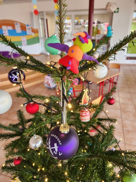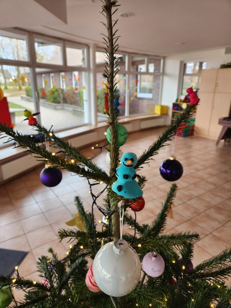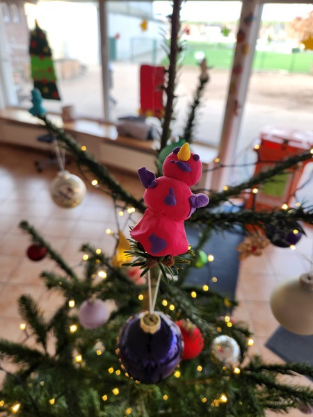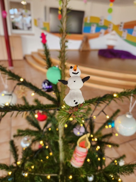 Statt der üblichen glänzenden Kugeln oder Lametta entschieden sich die Kinder gemeinsam für eine originelle Idee: selbst modellierte Knetfiguren als Baumschmuck. Es entstanden bunte Schneemänner,
